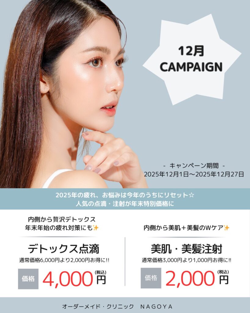 ① 一年頑張ったお肌とカラダに、ご褒美チャージしませんか? 人気の デトックス点滴(グルタチオン配合) &美肌・美髪注射が、期間限定で特別価格に🫶🏻 🌿 デトックス点滴(グルタチオン入り)疲労感・むくみ・お酒が続く時期のケアに◎さらに“美白系… -
