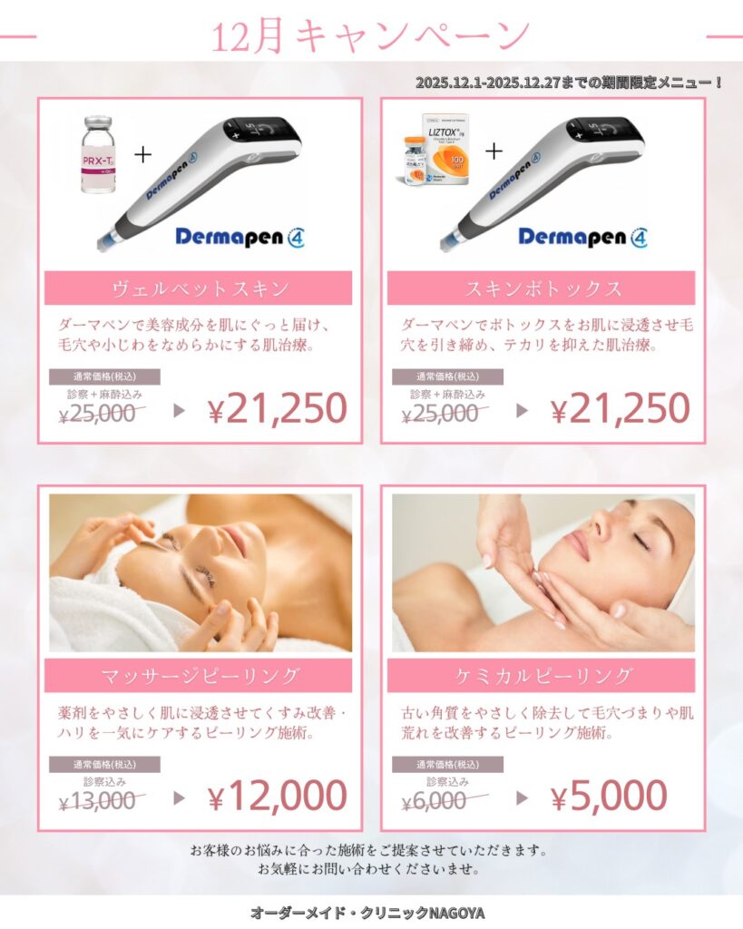 いつもオーダーメイド・クリニックNAGOYAをご利用いただきありがとうございます🫶🏻今年最後のお得なキャンペーンのご案内です💌 💎ヴェルベットスキン【価格】¥25,000 → ¥21,250 《通常より15%OFF✨》ダーマペン×マッサージピールで、つるんと透明感のあ… -